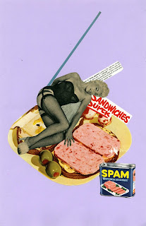 With the Pin-up girls I am juxtaposing the ladies with essentially disposable processed food. My intent was not to convey a message, but rather to set rules and limitations on the way I work, thus leaving the interpretation of the artwork to the viewer.